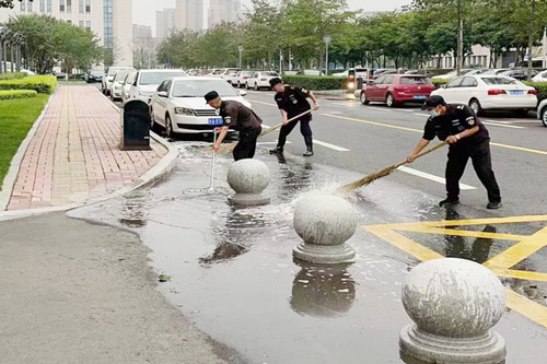 保安中隊(duì)及時(shí)清理市委市政府車場(chǎng)及周邊積水